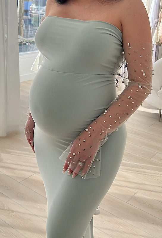 wears The Blaire Dress from the TMM x Nicole Combs capsule collection for her newborn photos.
