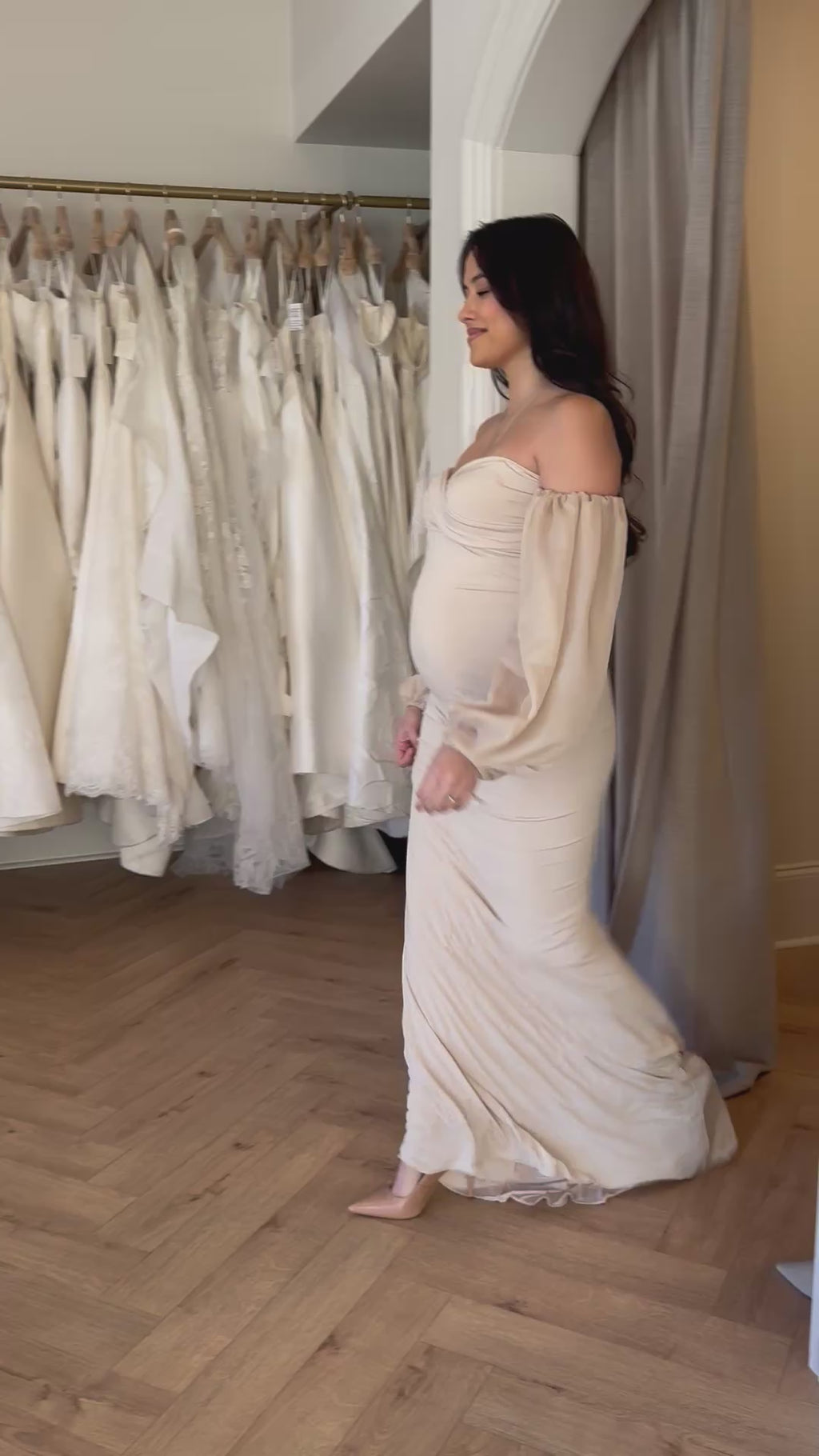 Custom made for Bump City from talented seamstresses in Los Angeles, we bring you the Lulu gown. Designed to sculpt and flatter, this elegant maternity gown features a body-hugging fit with luxe stretch fabric and full double lining. The versatile off-shoulder neckline and long draped chiffon sleeves that add a romantic touch. Finished with a floor-length hem.