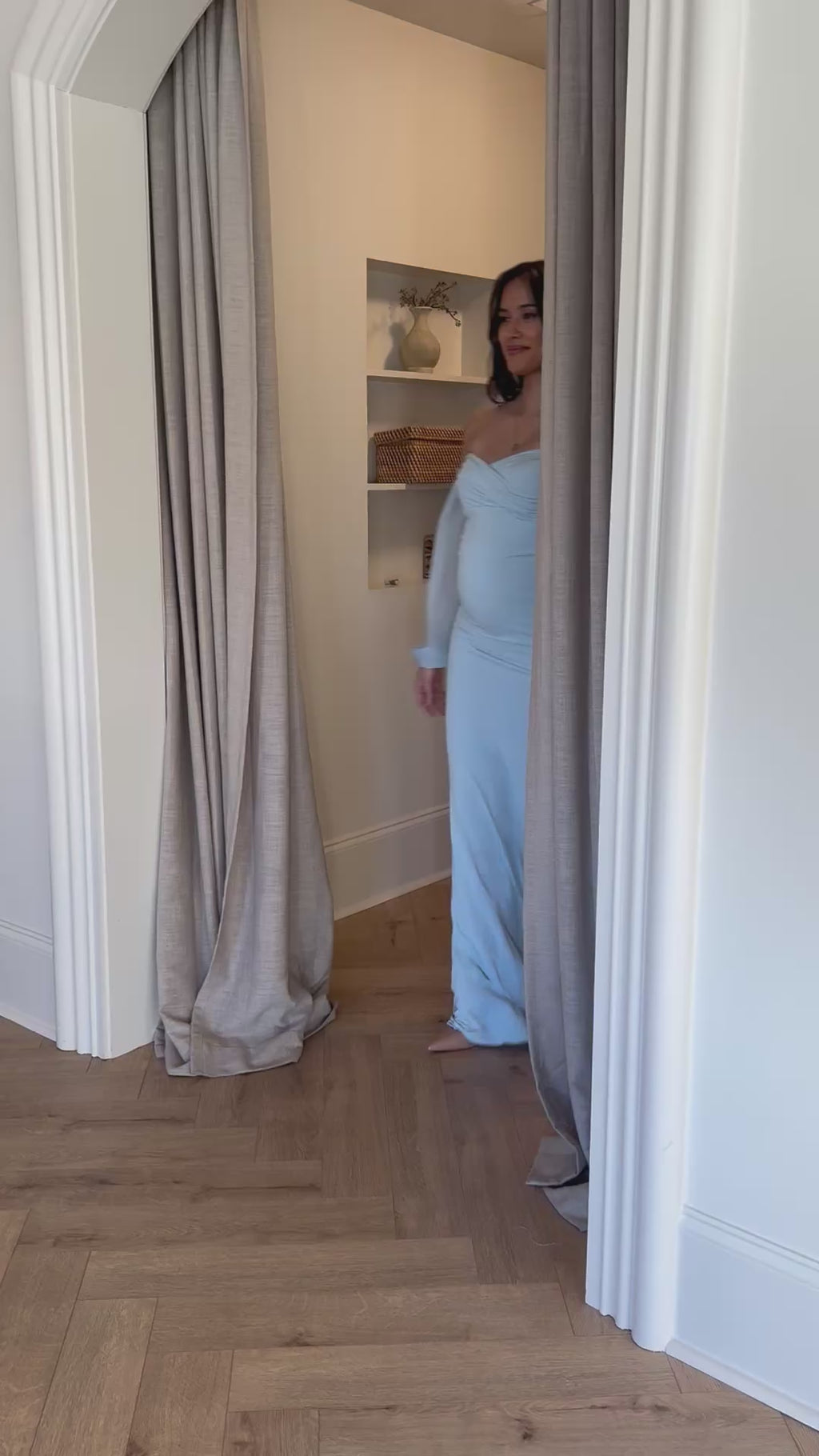 Custom designed for Bump City from talented seamstresses in Los Angeles, we bring you the Lulu gown. Designed to sculpt and flatter, this elegant maternity gown features a body-hugging fit with luxe stretch fabric and full double lining. The versatile off-shoulder neckline and long draped chiffon sleeves that add a romantic touch. Finished with a floor-length hem.