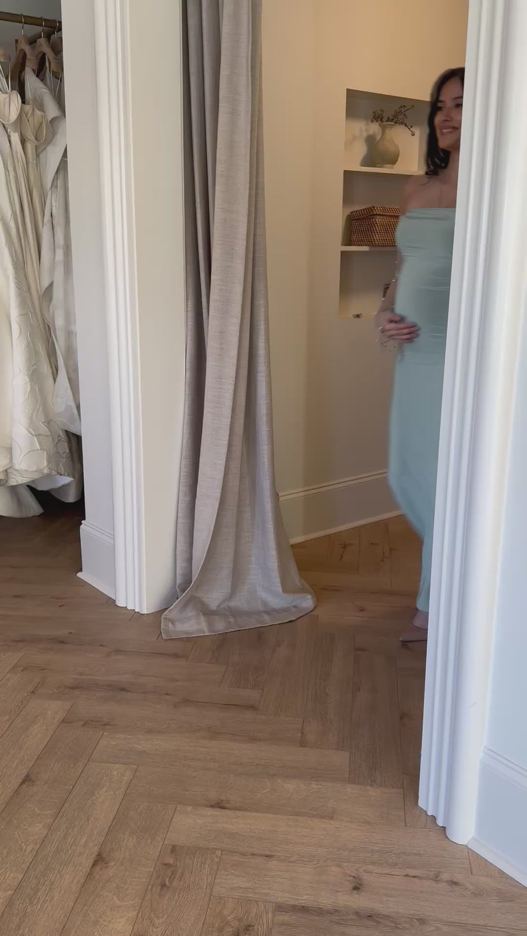 Sleek and sophisticated, this fitted maternity gown features a straight neckline and a structured bodice designed to flatter your bump. The highlight: elegant mesh sleeves adorned with crystal stone detailing, finishing in a delicate split for added drama. Crafted from luxury stretch fabric and fully double-lined for comfort and coverage. Perfect for baby showers, maternity portraits, or evening events.